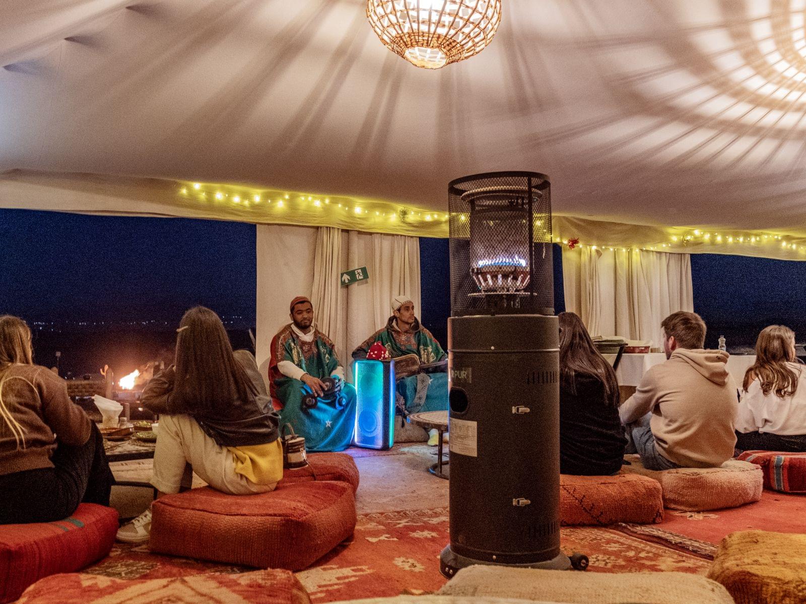Als die Sonne begann, hinter den Hügeln zu versinken, tauchte sie die Landschaft in ein warmes, goldenes Licht – das perfekte Fotomotiv. Die Silhouetten der umliegenden Camps zeichneten sich scharf gegen den Himmel ab, während die ersten Sterne über der Wüste erschienen. Nach diesem spektakulären Naturschauspiel ließen wir den Abend mit einem traditionellen marokkanischen Abendessen ausklingen, begleitet von einer Live-Performance einheimischer Musiker. Später versammelten sich einige Gäste um ein knisterndes Lagerfeuer, das die kühle Wüstennacht erhellte. Der Blick in den klaren, mit Sternen gespickten Himmel war der perfekte Abschluss unseres Tages in der Agafay-Wüste.