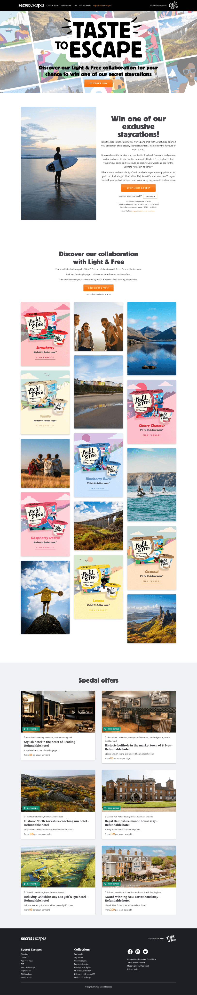 Im Rahmen eines Gewinnspiels wurden insgesamt acht Reisen verlost - eine für jede Geschmacksrichtung von Light & Free-Joghurts. Unter dem Namen „Taste & Escape“ bewarben wir die Kampagne mit On-Pack-Designs am POS. Dazu erstellten wir eine kreative Landingpage.