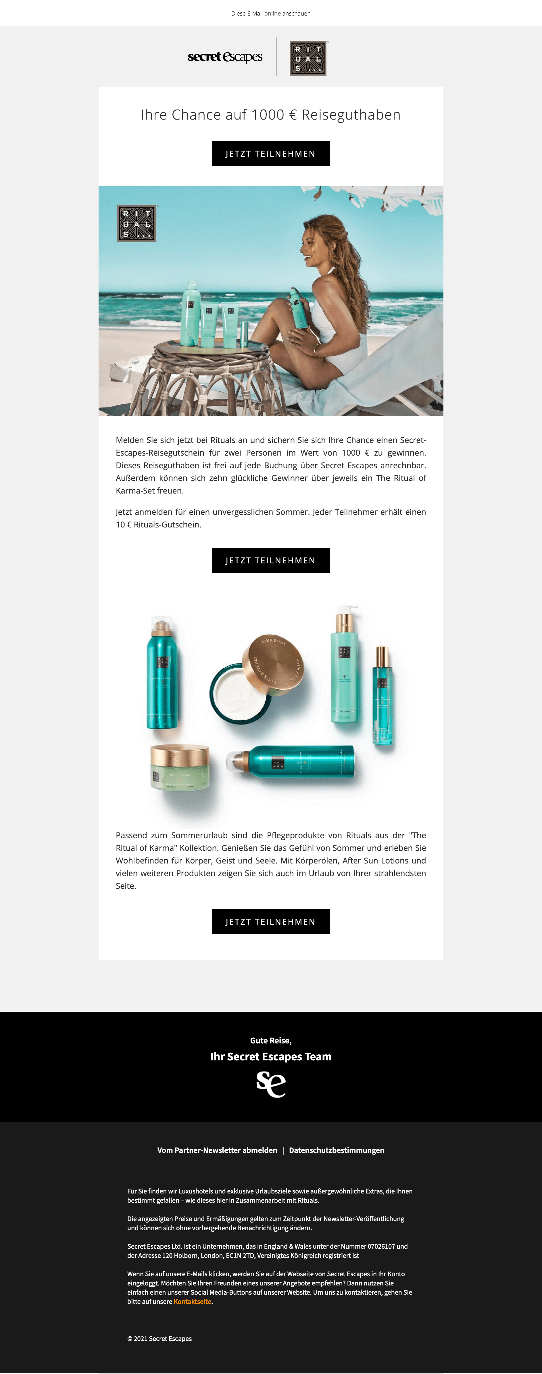 “In 2021, Rituals and Secret Escapes partnered up for the first time. Together we created a strong 360° media activation to drive leadgen during Rituals Summer of Kindness campaign. We used a mix of digital channels like website, newsletter and social media to create awareness and drive omnichannel engagement. Secret Escapes showed great efforts to match our needs and realizing our ideas. We were able to overperform main KPIs and already working on a 2022 plan to extend the partnership.”