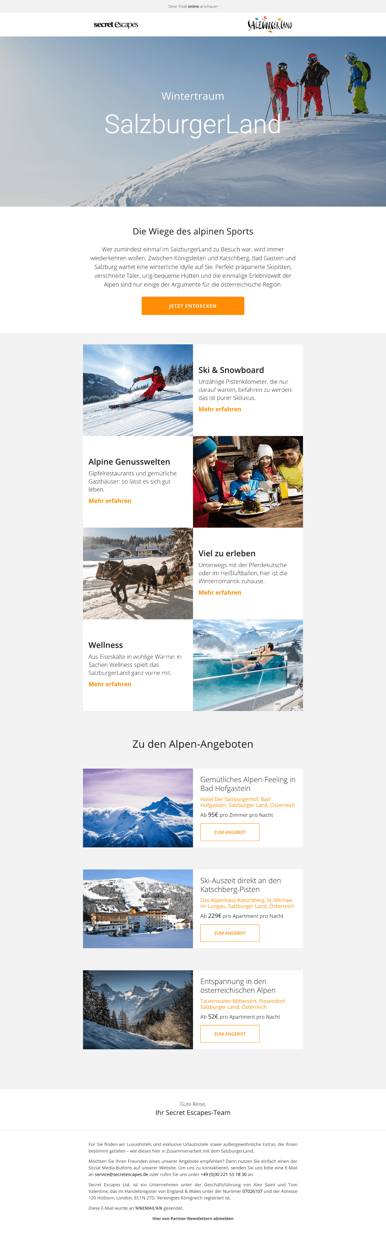„SalzburgerLand startete im Januar 2020 mit Secret Escapes eine Online-Cross-Marketing-Kampagne, um unser Winterangebot zu bewerben. Mit gezieltem Storytelling und Fotos auf der Landingpage, sowie gezielten Marketing­aktivitäten konnten wir poten­ziellen Urlaubern inspirie­rende Angebote in unserer Region zeigen. Die Zahlen geben uns Recht - die bei Secret Escapes gebuchten Nächte sind um 141% gestiegen."
