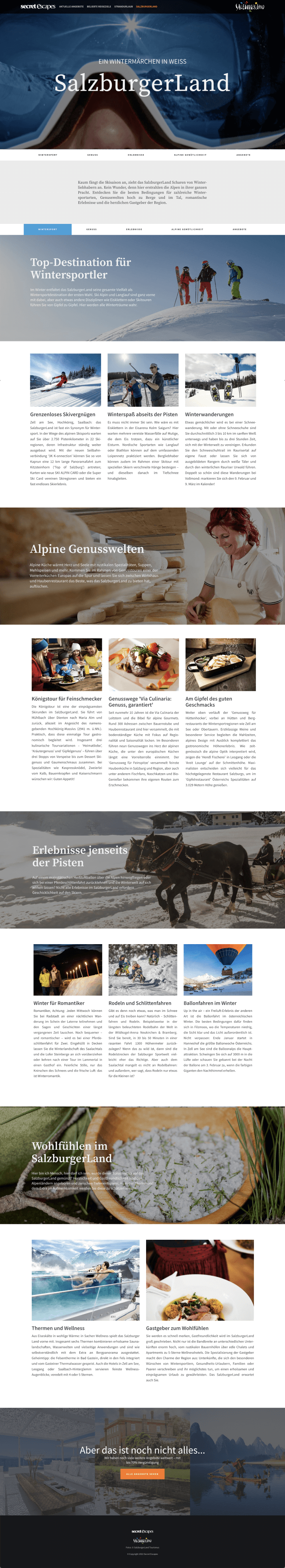 Wir entwarfen eine inspirierende Landingpage mit einem starken Destinationsvideo im Header und präsentierten im Text neben Wintersportaktivitäten auch Kulinarik, andere winterliche Erlebnisse abseits der Piste und Wellnessangebote im Salzburger Land.